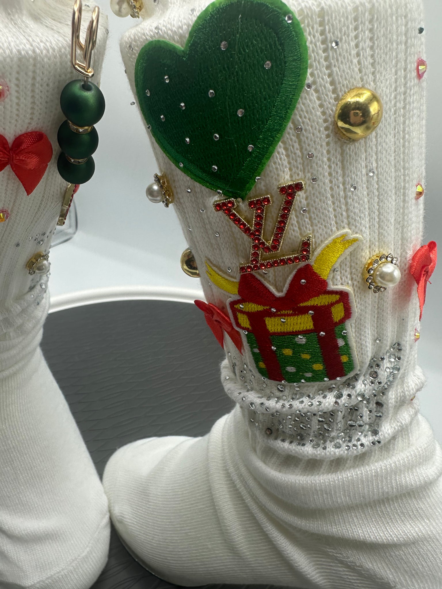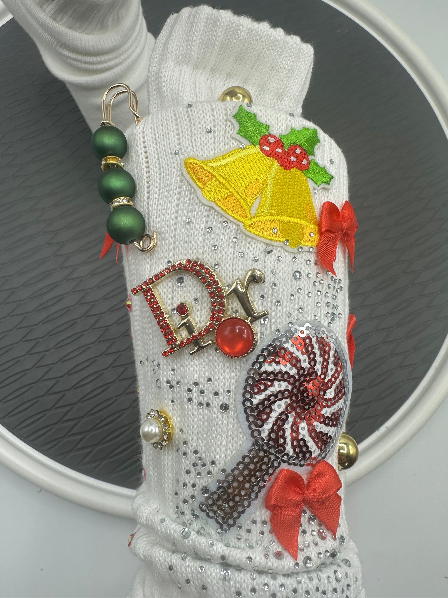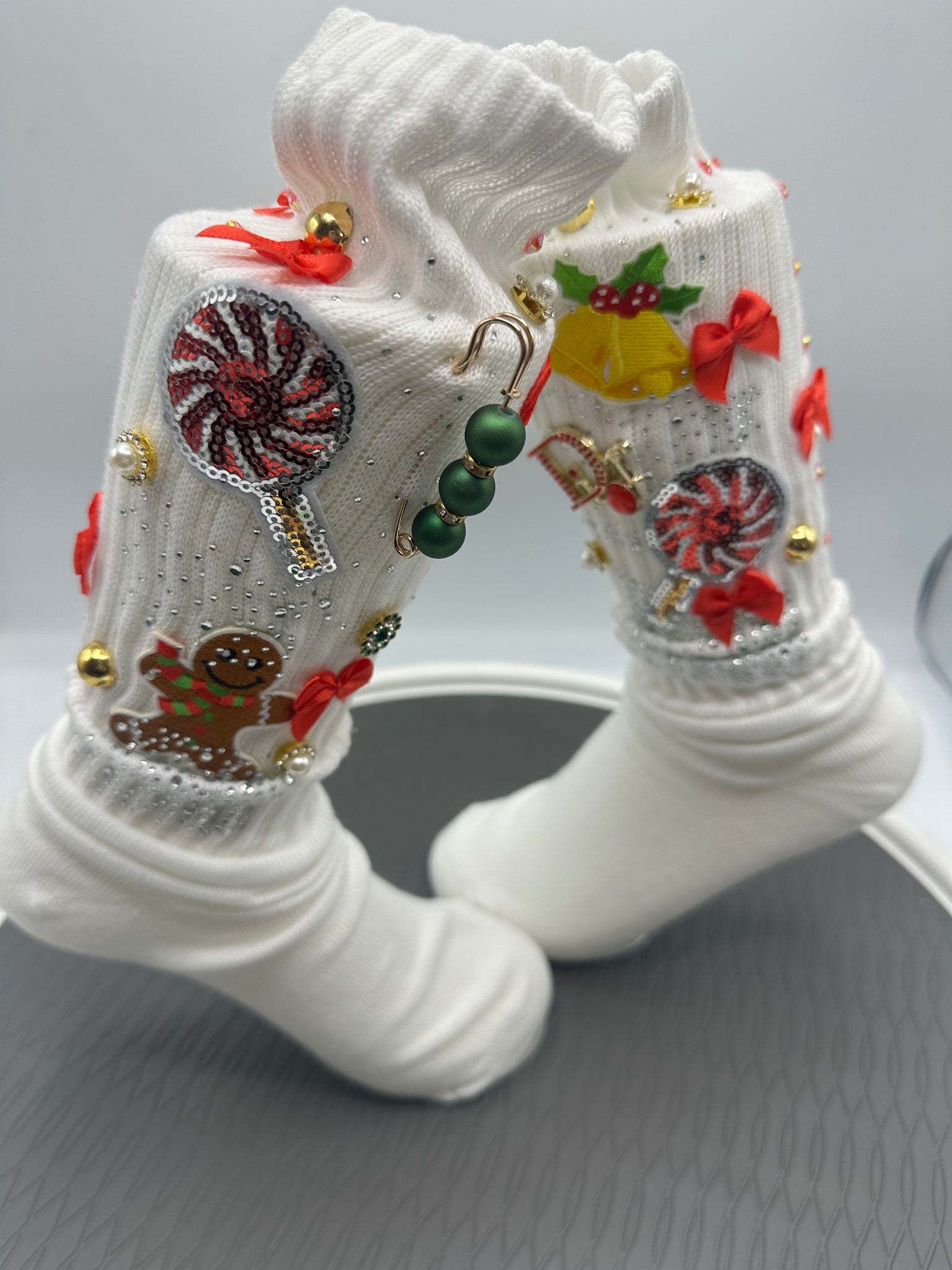 ✔️ 1 Pair of Junk Socks featuring layered holiday patches, beads, charms, sparkle accents, and hand-placed details